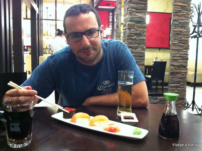 Un descans de 5 horetes i com a nous, ara només falta la anhelada dutxa…..que fem i refem fins que ens sentim ben nets. Posem una rentadora per 200 rubles, i mentre s’acaba i estenem, ens posem al dia de les tasques relacionades amb les noves tecnologies. Quan estem llestos, sortim a passejar, i buscar algun lloc on fer un mos, que hem perdut una mica la rutina d’àpats, i en necessitem un de normalet perquè les forces reapareguin. Avui toca caprici, i fem l’àpat en un lloc on podem menjar un parell de peces de sushi, i maki de caviar, combinat amb un parell de plats de fideus acompanyats de cervesa i coca-cola. Per menys de 20 euros tot….