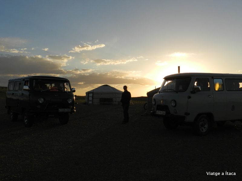 Ens encanta això de conviure amb les famílies nòmades, i només arribar ens preparen un te amb llet. Anem a veure els camells que tenen per aquí, i a fer unes fotos que el marc és incomparable. Ens criden per sopar, i ens mengem uns dumplings gegants que estan de mort, i quan acabem ens criden que la posta de sol és preciosa, així que a veure-la s’ha dit…
