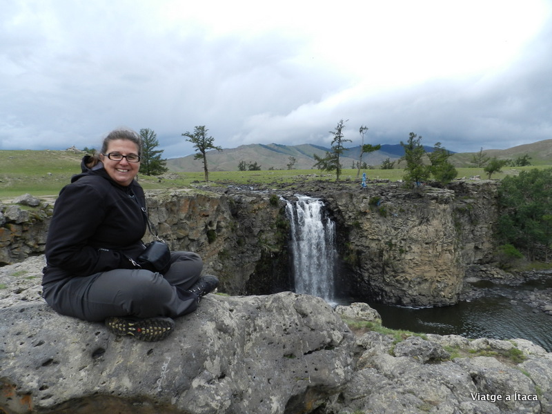 El riu, costa de passar, ja que algun dels cavalls no hi té massa interès, però finalment el podem creuar, i seguir gaudint d’aquestes dues horetes de passeig per aquestes terres, fins al que anomenen la waterfall, també coneguda com a salt d’aigua. Res de l’altre mon des del nostre punt de vista, però ens ha encantat venir a les muntanyes, canviar de paisatge, i aquesta aventura com a genets quasi mongols que som.