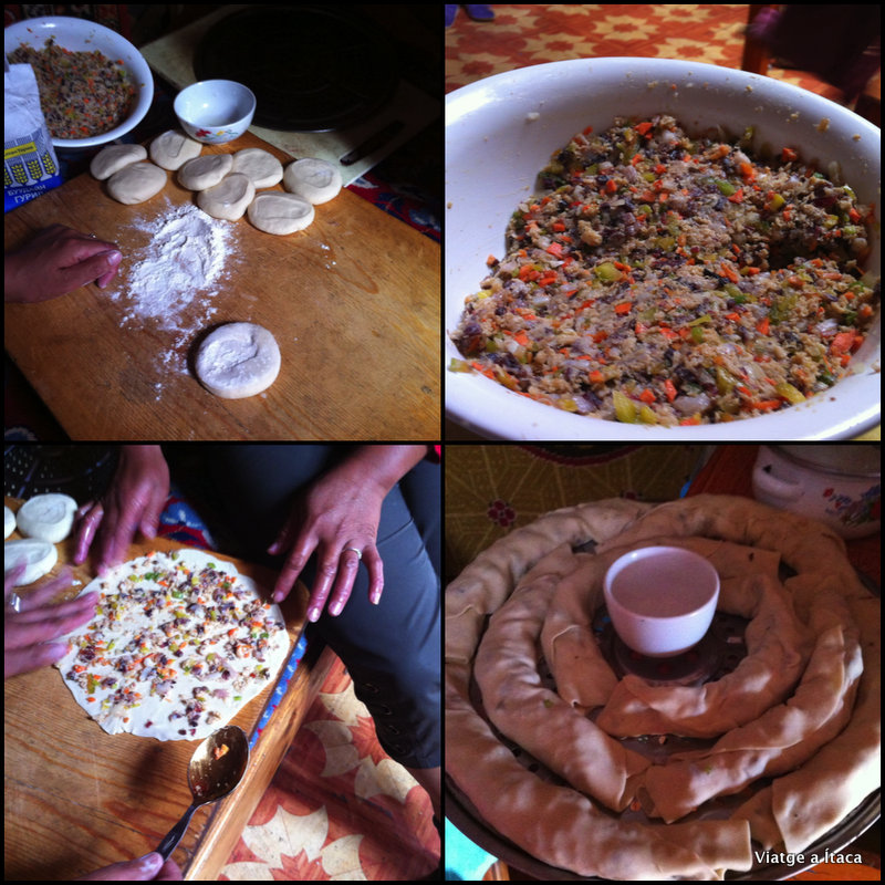 Es fa la massa amb la farina i aigua fins aconseguir una pasta compacta que es deixa reposar entre 30 i 40 minuts.