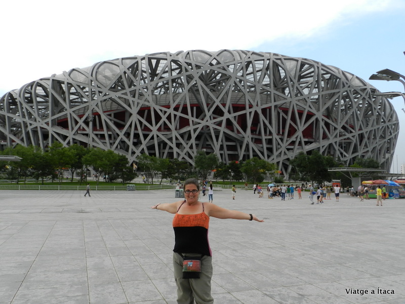 El niu, és espectacular, l’estadi on van celebrar les cerimònies olímpiques, ens encanta, no entrem perquè s’ha de pagar, però els ha quedat força bufó. Al costat, el Cub, on l’aigua i la natació eren protagonistes. De nit, i il·luminat ha de ser força espectacular.