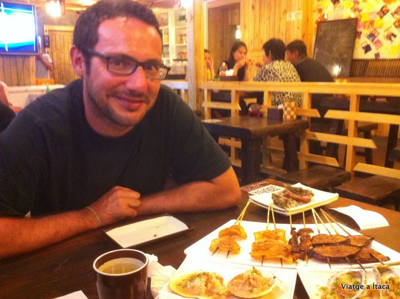 Com estàvem bastant rebentats, hem estat descansant al hostel i al vespre ja hem decidit sortir a sopar alguna cosa, i a on hem anat? Doncs al mateix lloc que ahir, ja que l’opció pinxos ens va agradar molt i el restaurant també, i ja que és la nostra última nit a Beijing… doncs a cuidar-se una miqueta toca oi?