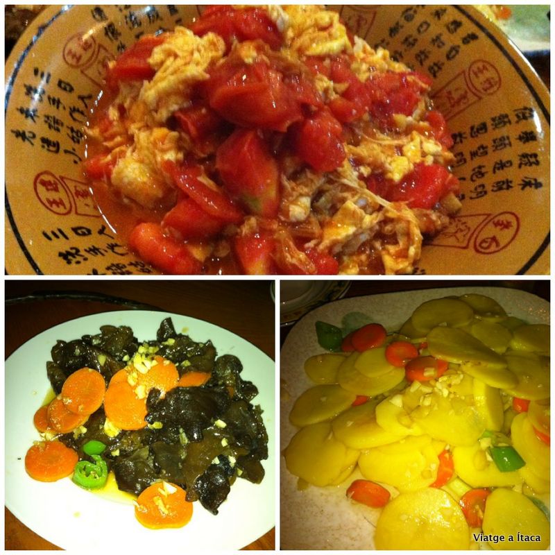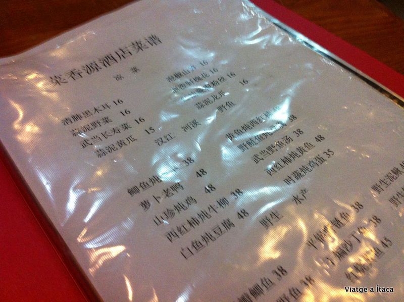 Hem deixat les motxilles a l’habitació i a… sopar!!! Que ja teníem gana!! I hem volgut fer-ho en el mateix lloc on dormíem. Però… hem tingut un petit problema… la carta només estava en xinès, i aquí no hi havia nevera, ni dibuixos. Així que hem recorregut a l’atzar, i com? Doncs triant tres plats aleatòriament guiant-nos només una mica pels preus.