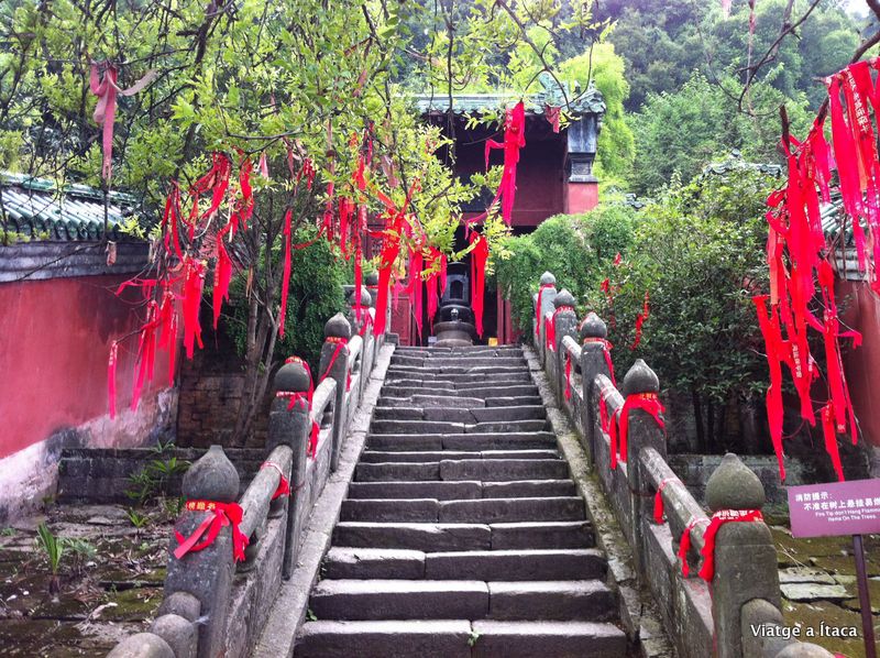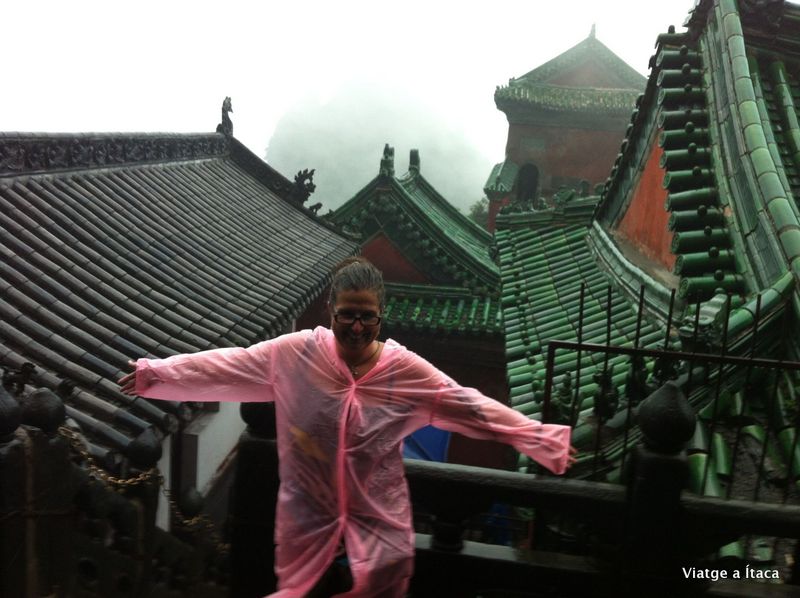Però no us penseu que on us deixa el telefèric ja és el final, d’allí encara et queda una pujadeta d’escales fins arribar a l’entrada del Palau, on has de tornar a pagar (si, si en aquesta muntanya és una sangria de diners) 27 yuans. I des d’allí, a seguir pujant escales cap amunt, i a sobre amb la boira que feia… no es veia res de res!!! Ni una miqueta de vistes!!! I a més… quan ja estàvem arribant a dalt de tot, hem començat a sentir bastants trons, i just posar el peu a la part més alta… xàfec a sobre!!!