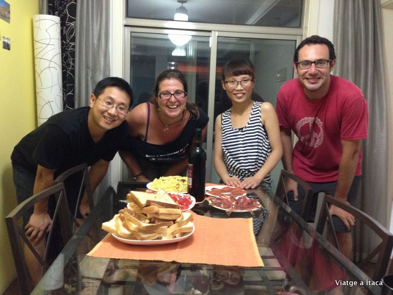 Una tempesta elèctrica impressionant, comença mentre som al metro, i un sms al Wilson que respon al parell de trucades i missatges que teníem preguntant si estàvem bé. Quan sortim del metro, ens passen a buscar amb el cotxe, i tornem cap a casa, on podem, a corre cuita i amb la paella que s’enganxa molt, fer la truita, pa amb tomàquet, una amanida de tomàquet i all. A més obrim els últims paquets d’embotit que portem, però la ocasió ho mereix, així que tot i que la truita no ha quedat massa bé d’aspecte, fem un soparet, on ens acompanya el fill dels nostres amfitrions, d’uns 8 anys i que és molt eixerit. Molta conversa en anglès, per conèixer la realitat xinesa i catalana, mentre anem fent via amb el vi. De menjar xinès, una mica de sopa que ha fet la seva avia, i un licor, que l’anomena vi xinès, però que és molt fort, 56 graus, i un sabor i entrada en boca de les que et fan revifar per dins….