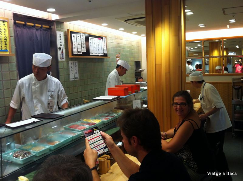 Desfem el camí, i després de bus, i un parell de trens, que podíem anomenar de rodalies, amb una puntualitat exagerada, arribem a la estació de Ueno. La una tocades, i tenim gana. Aquí les estacions son com centres comercials, on pots trobar botigues, restaurants, i altres coses que son un autèntic reclam, així que una barra de sushi sempre és benvinguda, i aprofitant de la oferta de migdia, fem unes quantes peces preparades al moment i davant nostre, que estan per repetir i repetir, però ens hem de contenir, que no ens agafi alguna cosa.