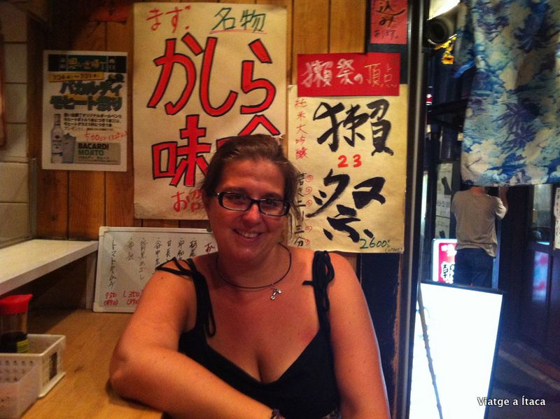 Havíem quedat amb el Guillermo i la Nerea per fer un soparet cap a les 9, al la zona del Golden gai, però per fer temps, i passejar una estoneta entre aquest espectacle de llums i gent, que son els carrers d’aquesta ciutat quan el sol s’amaga, anem cap al barri de Kabukicho, on veiem un carreró d’aquells que l’ambient convida a endinsar-si. Olors a menjar recent cuinat, fumejar de graelles, cerveses ben fredes, i petits grans raconets, on compartir barra o tauleta, amb un màxim de 6 o 7 comensals, i on fer una cerveseta gelada, i demanar que vols algun dels pinxos que menja el del costat, i que al final resulta estómac de porc…. Això si, un d’aquells moments que els tres vam acordar que son dels que es recorden, i una altre cervesa, per acabar de signar el pacte, de no oblit.