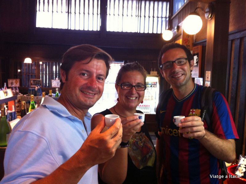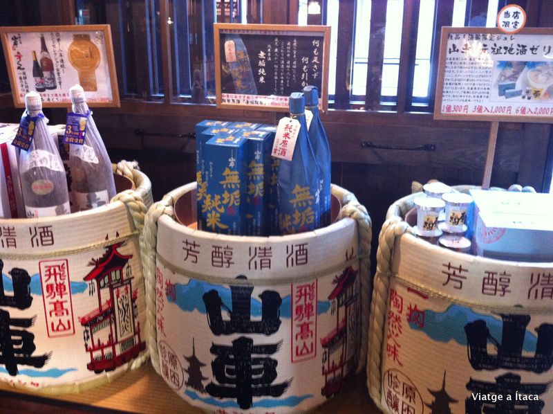 Hem entrat en una botiga de Sake, que més que botiga era una destil·leria, ja que Takayama té moltes petites destil·leries de Sake. I allà hem pogut xalar de valent!! Perquè? Doncs perquè pagant un got petit que després et podies endur i que només valia 100 yens, hem pogut tastar com uns 10 tipus de Sake, i així descobrir que no tenen res a veure uns amb els altres i que el món del Sake és un món potser tant immens com el del vi que em té fascinada, ja us explicarà El Tap Viatger a veure que ha descobert…