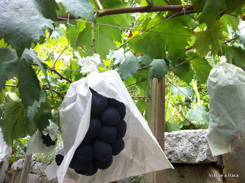 Interessant lo de les vinyes en parres altes, i ben embolicats els raïms ! Seran carets aquests vins, oi ?