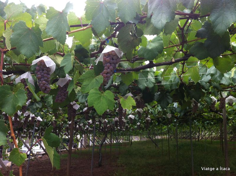 L’emoció d’arribar a un lloc amb vinyes, i que a més segons veiem des del tren, estiguessin plantades d’una forma totalment diferent a la nostra, ha fet que sense pensar, comencéssim a caminar sense rumb fix, però en direcció les vinyes, i així les hem pogut veure de ben aprop, estan plantades en altura, i a molts dels raïms hem vist que estaven protegits amb bosses de paper, que segons sembla són per protegir-los de la pluja i del sol.