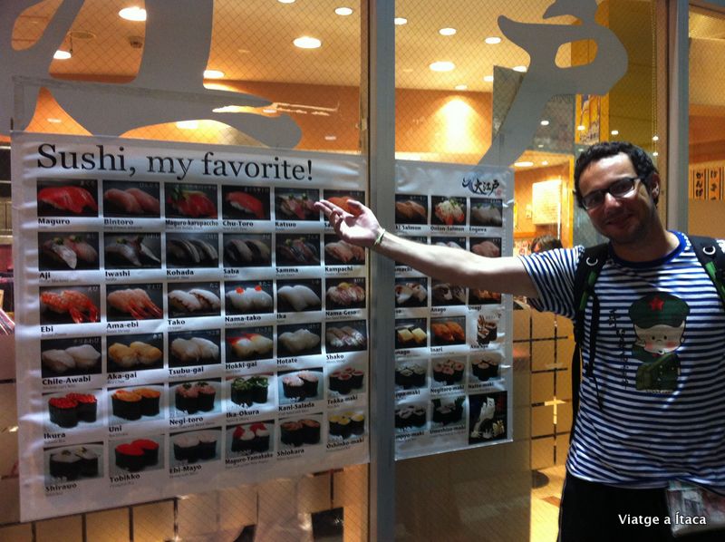 Els que coneixeu al Mario sabeu com li agrada la cuina japonesa o més concretament el sushi, i a mi, poc a poc el Mario m’hi ha anat introduint i en aquest viatge ja he fet una immersió total, provant tot tipus de peixos i realment m’han agradat moltíssim. Així que amb l’historial del Mario us podeu imaginar una de les seves prioritats pel dia d’avui, i clar, quin és el dia que va provar el sushi més espectacular? Algú ho sap? Jo si, el que vam anar a la llonja de Tsujiki, i no només pel que vam veure, si no més aviat pel que vam poder menjar. I justament aquell dia vam anar a parar a un restaurantet que tot i estar molt bo, no era el que li havien recomanat al Oscar.