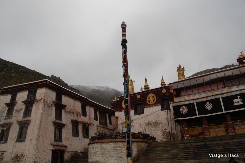 Així que caminant ben ràpid hem arribat a un dels costats del Potala cap a les 8 i a fer cua que fins a quarts de nou no obren. La reserva l’hem aconseguida per a les 12:40 (potser una mica tard, però potser no hauríem d’haver parat a fer el Sweet Tea no?), i ja amb la reserva feta, hem anat cap a la nostra primera destinació del dia, el monestir de Drepung, un monestir del segle XV i que es troba a uns 8km al oest de Lhasa. Per anar-hi, hem agafat un autobús que ens ha portat per 1 yuan fins a una carretera on hem hagut d’agafar un altre autobús fins al monestir pel qual hem pagat 2 yuans i que a més a mig camí parava per a que compréssim les entrades. I…. oh!!!! Havíem tingut massa sort últimament amb el temps i s’ha posat a ploure, així que quan hem arribat a l’entrada del Drepung, el guia ens ha suggerit que anéssim a fer un te mentre esperàvem que pares de ploure.