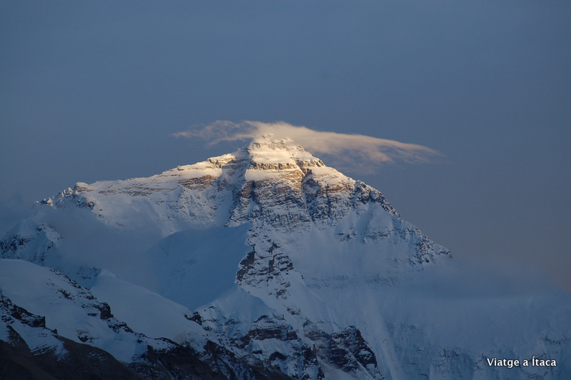 Mentre el conductor, va en busca d’algú amb les eines necessàries per poder soldar la part inferior del vehicle, nosaltres fem la comanda per sopar, i mentrestant anem a veure com la gran muntanya canvia d’aspecte a cada segon, amb els diferents reflexes de la llum del sol. No es veu tant gran des d’aquí, però és que tenim bona part del camí fet, perquè dels 8848 metres del seu cim, nosaltres ja estem a uns 5.200. Les xifres fan marejar una mica, així que tindrem el oxigen a ma per si de cas. L’últim raig de sol, deixa només el cim il·luminat, i alhora apareix el nostre guia que ens explica que aquesta visió te molt a veure amb que l’anomenin la muntanya sagrada. Ens diu que el que nosaltres gaudim des d’una visió estètica perfecta, ell ho gaudeix des de la vessant religiosa. De fet, poc a poc, i sense temples on explicar mil vegades el mateix, i parant a cada estàtua, ens comença a agradar una mica més aquest guia.