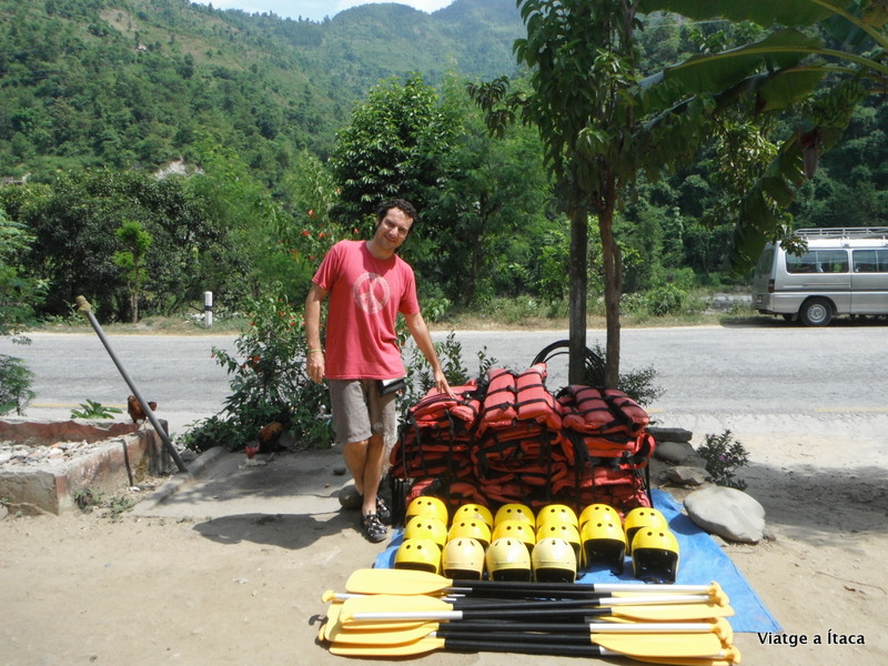 Quatre xinesos molt simpàtics també esperen i podem xerrar una miqueta. Arribem sis nois d’Emirats Àrabs, i finalment uns catorze més de xinesos. Un cop tots allà, comencem a agafar l’equip; casc, armilla i rem, deixem la motxilla que ens la guardin a la furgoneta, i amb les coses de valor petites, que aniran dins d’una bossa estanca baixem seguint el guia cap a la vora del riu, on ja estan les barques preparades. El guia és un noi jove, molt trempat i bufó, que a més de ser una autèntica roca, se’l veu que sap el que fa.