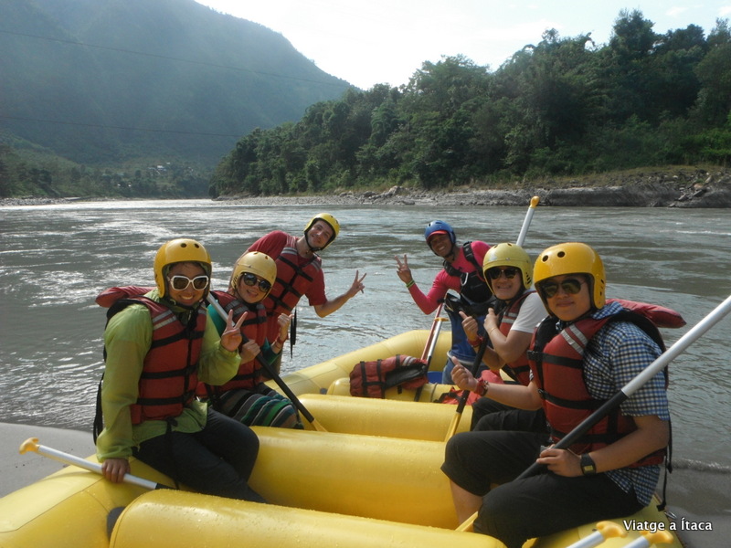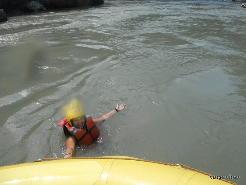 Puja el guia a la part posterior per guiar la direcció i dominar la embarcació, i comencem a remar cap al mig del riu. Alguns ràpids que controlem amb la perícia del guia, i ens mullem mentre els somriures apareixen. Tranquil·litat després per poder contemplar el paisatge espectacular, i més corrents ràpides que fan trontollar la nostre estabilitat però sense caure. Una zona tranquil·la que aprofitem per nedar qui vulgui, així que l’Eva i jo cap a l’aigua, però sense deixar-nos anar de la corda que porta lligada la barca.