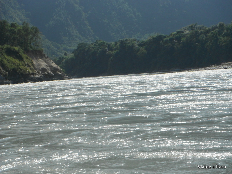 L’aigua d’aquest riu és freda, no recordem el nom del mateix, però baixa des de la serralada del Himàlaia, i va a morir al riu Ganges ja a la Índia. Així que sense saber-ho estem nedant per aigües que discorren entre dos referents d’aquest mon.