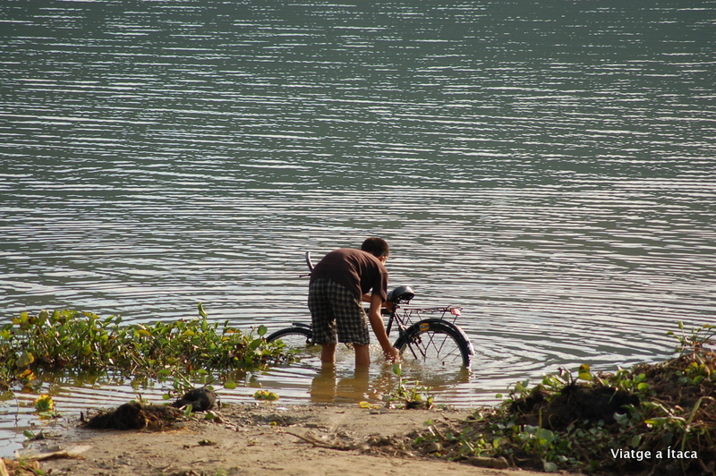 Pescadors, nens, vaques, i alguna dona que es banya vestida a dins del llac ens conviden a fer algunes bones fotos. El camí s’acaba i retornem al carrer principal. Un lloc regentat per una família que sembla hindú, reclama la nostre atenció, i allà fem el que podem anomenar sopar cap a les sis de la tarda. Uns quants plats per picar, i el preu no és excessivament alt. Aquí hi treballa tota la família, el pare de família capta la clientela, la mare ajuda a la cuina a un noiet que creiem que és el fill, i dues noietes molt eixerides i espavilades de les quals la més petita creiem que no supera la desena d’edat, serveixen les taules, i estan per la caixa. Hi ha unes quantes taules, i és dels llocs amb millor qualitat de servei que hem trobat per aquí.