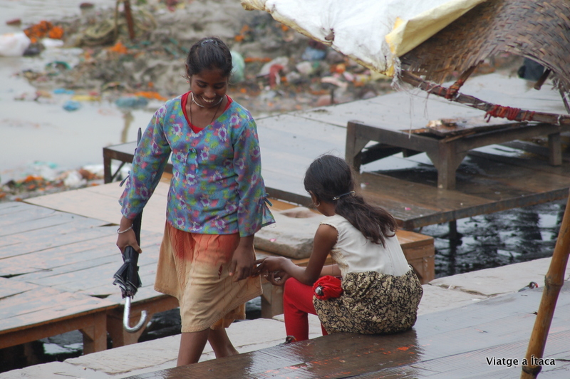 La pluja, el fang, els animals, i la brutícia fan un mix al qual ens anem acostumant, però que no és massa recomanable per a gent aprensiva. Després de passar alguns carrers, d’aquesta laberíntica ciutat, anem a parar a un dels dos crematoris que hi ha. L’home ens explica moltíssimes coses interessants, al voltant de la ciutat i del que anem veient. Sabíem on veníem, i el que hi veuríem, però potser no estàvem del tot preparats per la imatge a la retina. Fogueres de llenya al davant del riu, i en una d’elles, mig tors humà sobresurt de les flames. Nosaltres a vuit metres fem el cor fort. Els nens fan i desfan per allà, entre uns quaranta homes, alguns dels quals ens miren amb curiositat. De dones no n’hi ha, perquè segons ens explica, no hi poden venir perquè no està permesa la tristesa en aquesta mena de rituals. Sortim d’allà amb el cor encongit, i seguim passant per carrerons enfangats, on les vaques i gossos busquen quelcom per menjar. Una processó d’homes que porten uns cossos tapats, que suposem morts, i un home estirat en mig de la carretera, a qui ningú sembla fer ni cas.