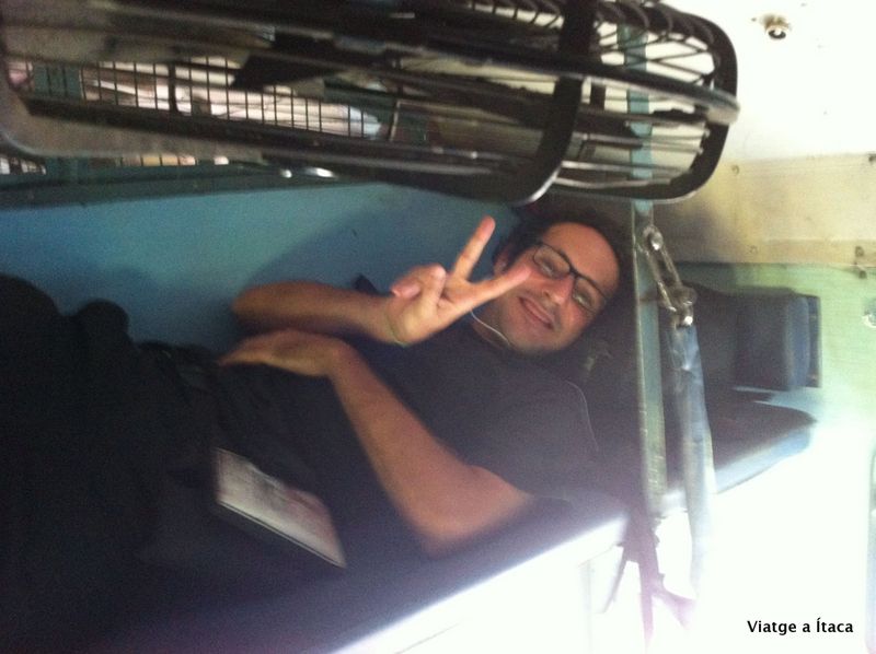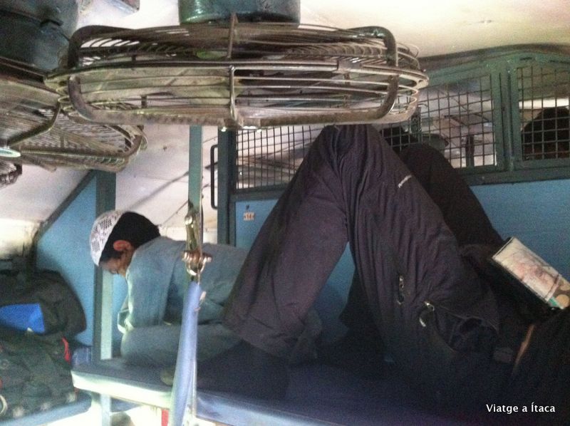 Avui, ens esperen 18 hores de tren, en lliteres a la classe més barateta, i la majoria del trajecte és de dia. Així que sense saber massa be que esperar pugem a les nou al tren. Tenim les lliteres de dalt de tot i la del mig, i quan arribem, ja veiem que hi ha força gent al nostre “compartiment”. Desallotgem, i posem alguna motxilla a la llitera superior. Una dona gran i un senyor, han agafat les lliteres de baix, i estan com a casa seva. Durant el dia, no s’acostumen a estirar les lliteres del mig, perquè si no, no queda suficient espai per seure, així que l’Eva puja a dalt de tot per intentar dormir, i jo m’assec al raconet que em deixa l’home que estira les cames mentre em parla en Indi. Comencem a fer parades, i a pujar i baixar gent, que segurament sense bitllet, prova de seure en qualsevol espai que quedi buit si ningú li diu el contrari. Ens respecten força als occidentals, i quan hi ha una llitera ocupada no s’hi posen, però a la llitera baixa, sembla el Corte Ingles de Plaça Catalunya de tota la gent que hi ha. Hi ha un vaivé de gent, ara es buida, ara es plena, i quan arriba un matrimoni de mitjana edat, els pregunto si tenen la llitera de dalt, em diuen que si, i els dic si no els importa canviar el lloc. Contesten afirmativament, i amb un somriure d’enorme satisfacció faig un parell de salts, i faig companyia a l’Eva a les lliteres superiors.