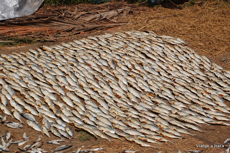 El carrer principal de Benaulim és paral·lel a mar, a entre deu i quinze minuts a peu, de l’aigua. Hi ha dues entrades a platja properes, que s’hi arriba per una carretera asfaltada, i com la més propera, on es troben diferents bars i restaurants, ja la coneixem, hem anat a l’altra. Per arribar-hi, cal seguir el carrer principal direcció sud, sortir del poble, i al final, un trencant a la dreta. Aquest camí molt menys transitat, l’aprofiten els pescadors pel posar una part del peix pescat a assecar a un cantó de la carretera. Els ocells, el sobrevolen, però no arrisquen de moment i no s’apropen.
