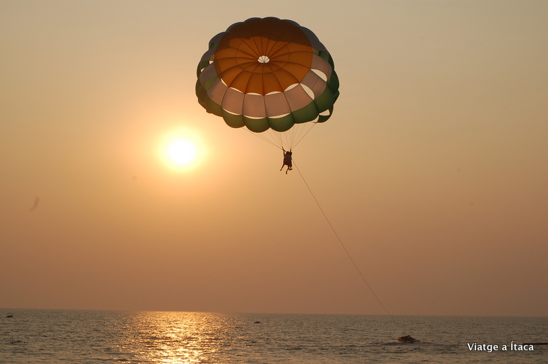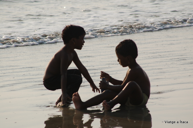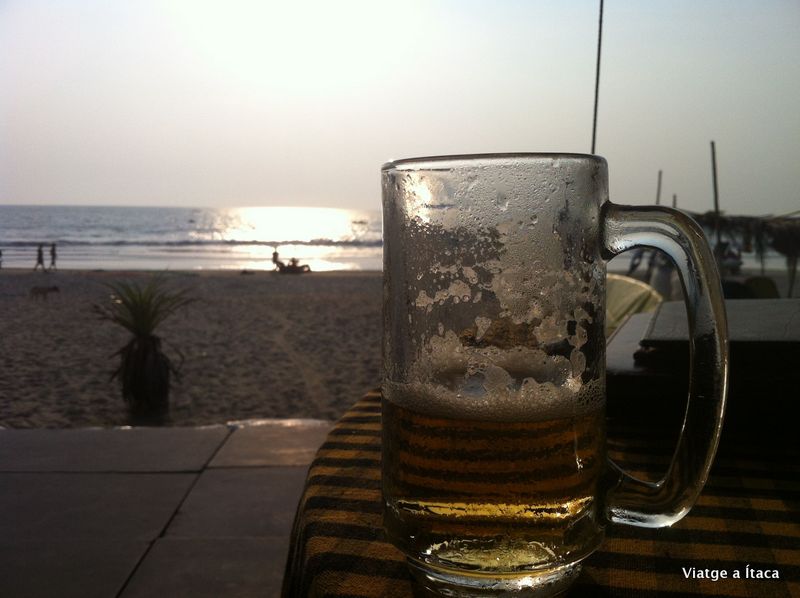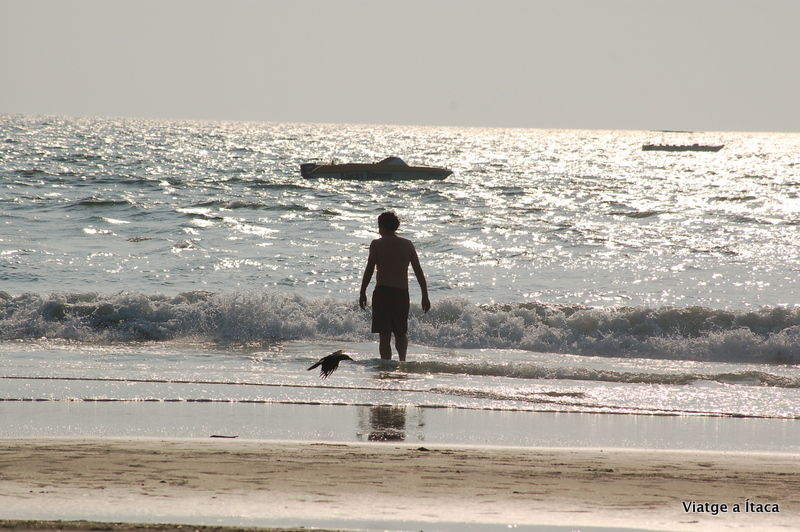 El primer bany de mar en catorze mesos, aigua tèbia tirant a calenta, i força neta. Primers sensacions de l’oceà Índic, immillorables. Fem com els crancs que hi ha per tot arreu, i passem l’estona entre la sorra, i l’aigua, gaudint d’aquesta troballa inesperada que han sigut les platges de Goa.