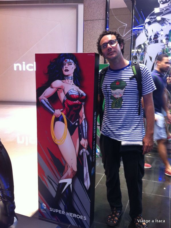 Una botiga ens crida l’atenció, i com no, hi entrem. Es plena de coses relacionades amb les figures dels còmics i el mon dels superherois. Espectacular!!!!!! Un Batman per aquí, el Joker a l’altra cantó, i la dona meravella… no l’Eva no…la dels còmics…. Les samarretes xulíssimes, però avui no en comprarem.