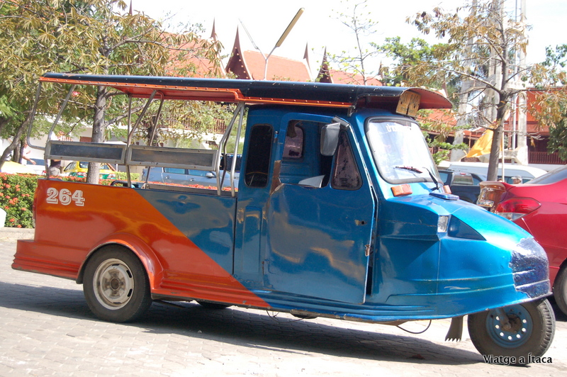 Els tuk-tuks per aquí, semblen autos de xoc amb la carrosseria que protegeix la roda davantera de la moto, i a més tots de colors ben vius.