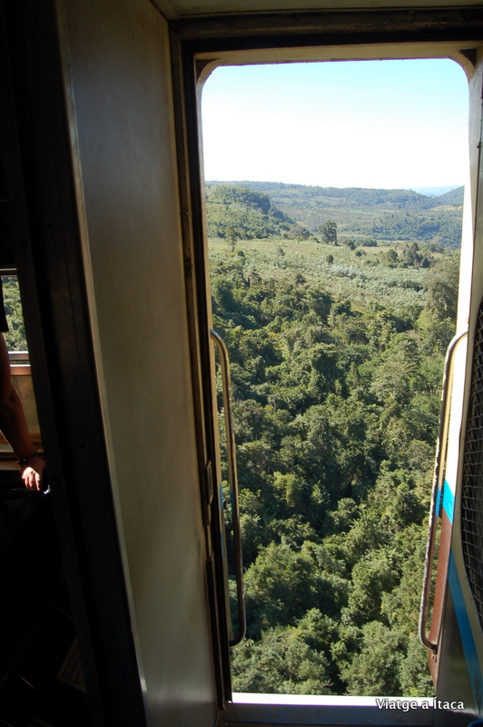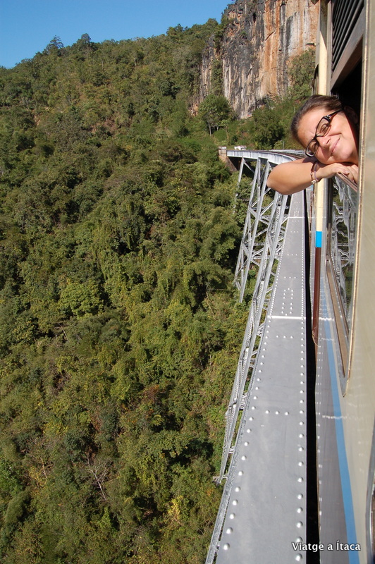 A partir de la quarta hora, el plat fort. Aturada de la màquina per part del conductor. Tots d’en peus. Moviment de càmeres, i intentar agafar un bon lloc a la finestra. Engeguem, velocitat adequadament lenta, ens apropem, ja arriba, i pensar el que devien patir en aquest moment fa uns anys… El viaducte de Gokteik majestuós apareix entre aquestes muntanyes tallades. Es va construir cap al 1900 i discorre per una alçada d’uns 100 metres respecte al riu. La sensació al creuar-lo és espectacular, sobretot si t’apropes a les portes que no tanquen correctament, i veus com no hi ha cap protecció, i que un pas en fals et podria dur avall, ben avall. Vaig llegir a www.voltantpelmon.com, on explicava que aquests tipus de pont es construïen antigament seguint l’infal·lible mètode d’assaig-error, on si passava el tren perfecte, i si no, doncs més acer…