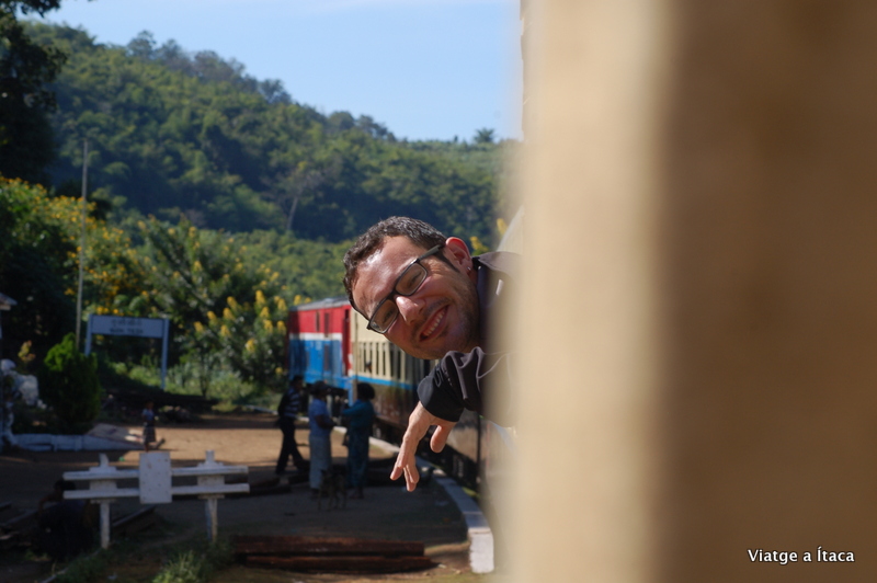Abans de les nou i mitja, hora informada al plafó, un potent i inconfundible so anuncia l’arribada del tren. Hi ha dos tipus de vagons, un més car de 6 dòlars, amb seients tous, i un de 3 dòlars amb seients de fusta. Nosaltres seguint les recomanacions dels blogs llegits agafem el car, perquè segons podem comprovar tot iniciada la marxa el bots són continus i exagerats. Una mena de dansa ferroviària que segueixen cada vagó pel seu compte, sense cap harmonia, com si anés cada un a la seva i en qualsevol moment es poguéssim separar. És divertit, si mires per la finestra sembla que el tren balli una conga amb un moviment discontinu i nerviós. A dins, no va ple, i la gent d’aquest país es mereix un capítol a part, perquè en les distàncies curtes és on et roben el cor. Somriures de nens i adults, mentre comparteixen alguna de les coses ben variades que poden tenir per menjar, i fan que el temps passi volant al seu costat.