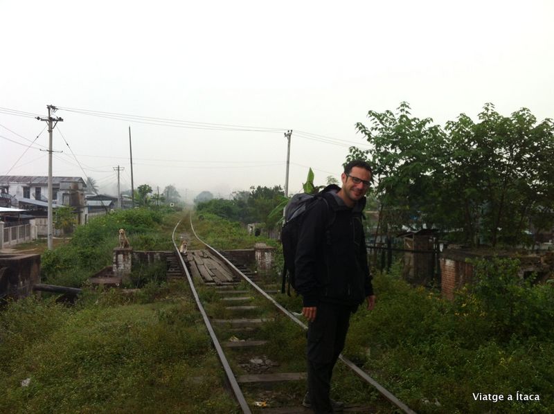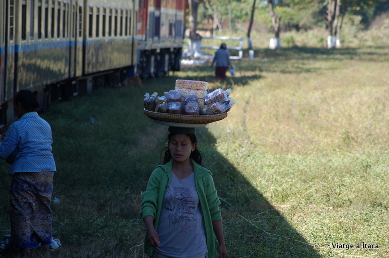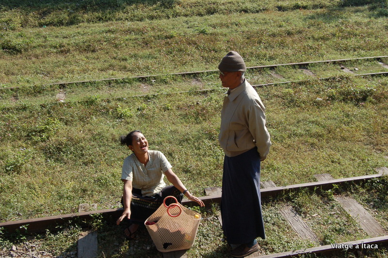A les vuit i mitja obrien la venta de tiquets, per al tren que a les cinc sortia de la població de Lashio. Nosaltres amb esmorzar fet, i motxilles a l’esquena caminàvem per camins de sorra mentre el tren ja feia recorregut per trobar-nos a l’estació. La orientació en aquests pobles no sempre és fàcil, però sempre pots tirar de recursos, i en aquest cas quan apareix la via del tren sota els teus peus, saps que només hi ha dos camins a agafar, dreta o esquerra, perquè aquí de vies només n’hi ha una.