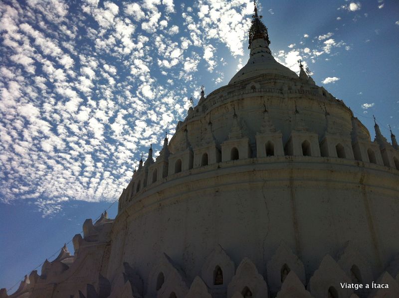 Un cel blau radiant, i núvols d’aquells que son d’un contrapunt embellidor a les fotografies, a més el nostre comité de recepció a Mingun son unes magnífiques figures blanques que miren impertèrrites el mar, mentre custodien el temple daurat del darrere.