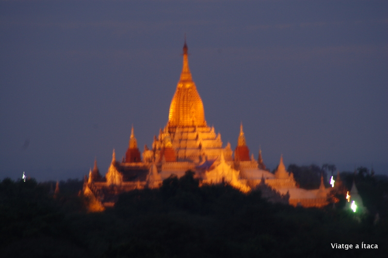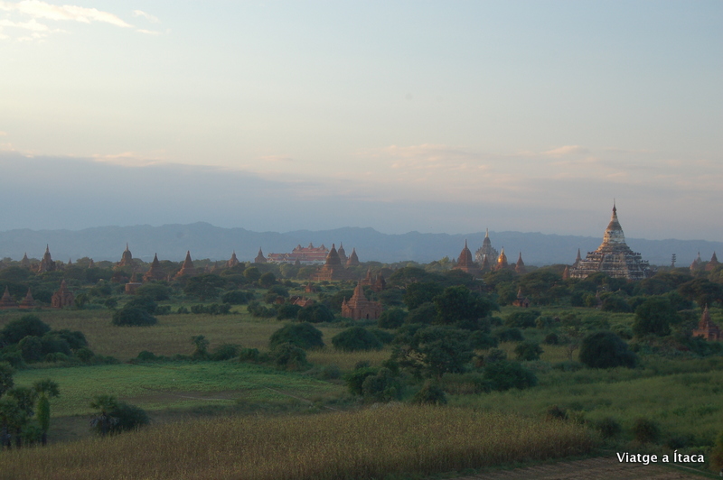 Diuen que una de les coses més maques de veure a Bagan és la sortida i la posta de sol, tot pujats en un dels seus temples i veure així la immensa quantitat de pagodes tenyida pels colors que aporta una sortida o una posta de sol, barrejada amb la boira que és genera per la temperatura.