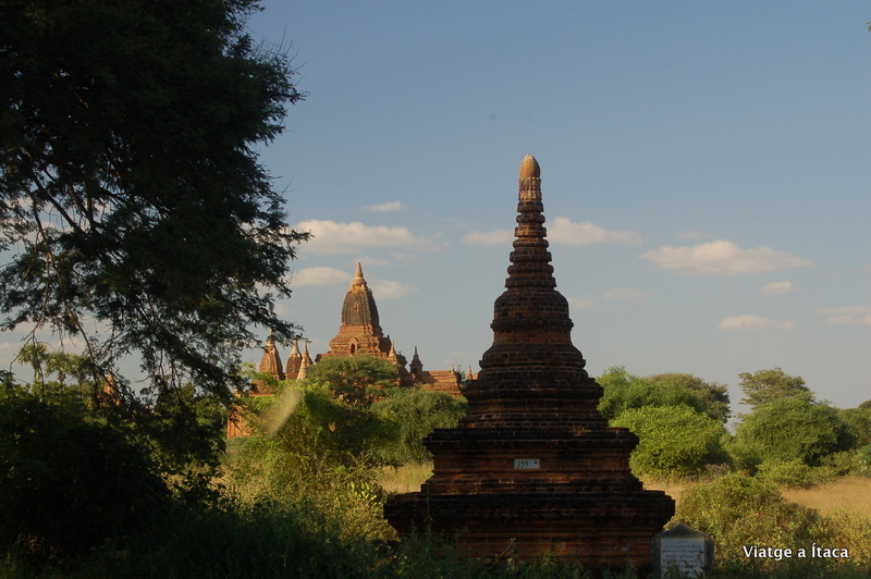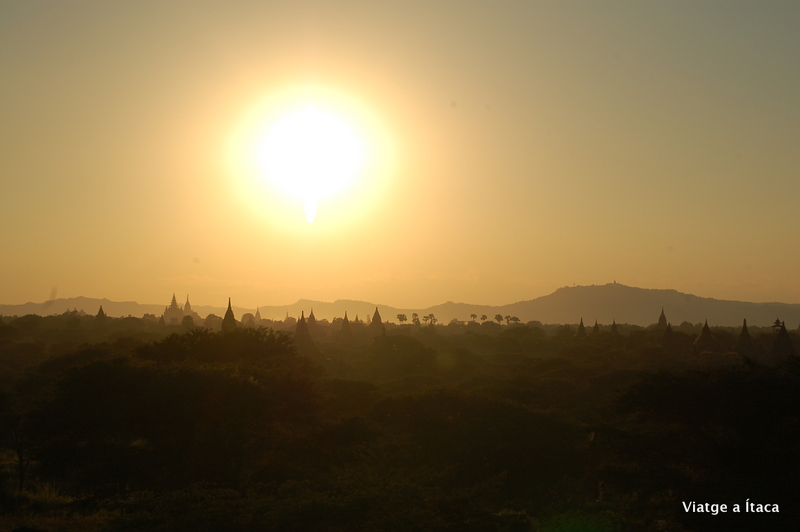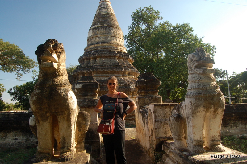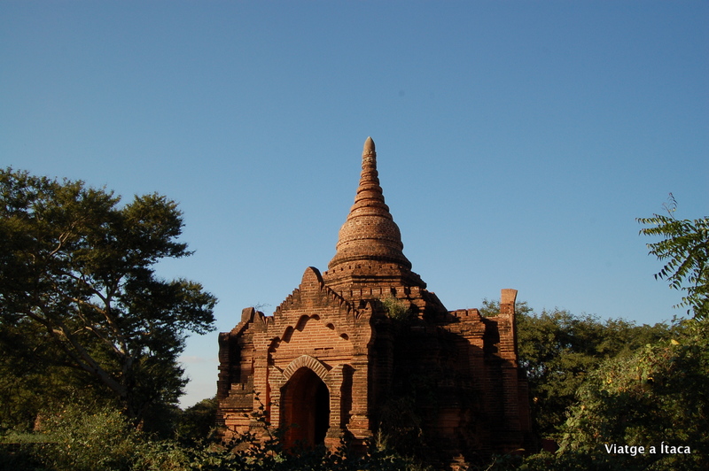 Aquí a Bagan, només cal caminar quatre passes i trobes temples arreu, i aprofitant aquesta circumstància, passegem una miqueta i ens endinsem a peu per algun dels molts camins de sorra, que passen a la vora dels temples. N’ubiquem un que si pot pujar a dalt, així que ja tenim lloc desitjat on veure com el sol es pon, ara seguirem sense rumb fix, cap aquí i cap allà sota una calor que fa suar.