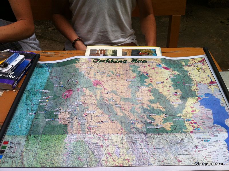 L’habitació era senzilla, però neta i confortable. La fusta sembla que ha aïllat el fred, i amb la manta fins a les orelles hem dormit d’allò més be, des de que vam arribar de matinada fins a les nou hora en que hem anat a fer esmorzar. Allà un àpat força complet, com a tots els allotjaments birmans que hem trobat en el camí fins ara. I mentre prenem el cafè amb llet de sobre del tipus tres en un, unes paraules en català que arriben des de la taula del costat. Preguntem i afirmativament ens responen que si que ho són de catalans. Són l’Olivia i el Dani, una parella molt joveneta, des de la nostre perspectiva de tocar els quaranta, i que durant un any estan viatjant. Amb ells, moltes històries per explicar. La seva, viatjar amb un pressupost reduït per allargar els diners, i a més fugint de moltes de les coses turístiques que es poden visitar. Molt interessant, que demostra que no cal un gran pressupost per gaudir d’això de viatjar. Han fet entre altres coses, Cambotja en bicicleta i Vietnam en moto, i els podeu llegir a: http://visionesnomadas.com/