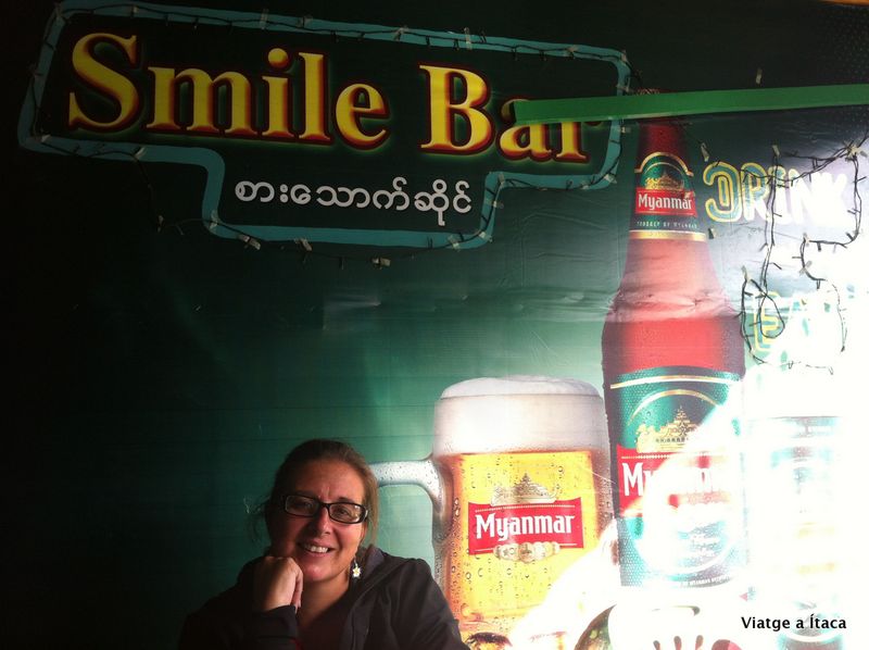 Després tornem cap a “casa”, disposats a fer tasques de logística, però el Dani i la Olivia són per allà, així que xerrant i xerrant se’ns fa quasi l’hora de sopar. Decidim anar els quatre junts a un lloc on ens han dit que fan una sopa que s’assembla a les de la mare. Està força bo aquest brou, però no arriba al nivell de casa. Després a fer una cervesa a un bar que ells havien vist, i que s’assembla a un pub occidental, però a la manera birmana. Una barra circular, amb un cambrer al mig, i entre la foscor, una guitarra que sona, i que és acompanyada per multitud d’homes del país que canten cançons pròpies i d’altres que nosaltres coneixem però traduïdes a la seva llengua. L’espectacle ens encanta, així que vaig a buscar al Gonzalo i a l’Isis perquè no s’ho perdin, i tots sis, fem alguna cervesa, i aquest rom birmà de preu quasi irrisori que veu tothom i que no està del tot malament.