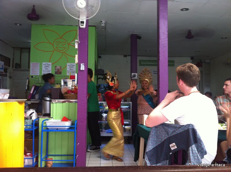 Una altra cosa que hem fet, ha sigut deixar-nos caure pel May Kaidee, el restaurant on l’Eva va aprendre algun dels secrets de la cuina tailandesa. Però aquesta vegada va servir perquè tastéssim algunes delicatessen culinàries de llepar-se els dits. Un Pad Thai de verdures, que en aquest restaurant són vegetarians, una sopa Tom Ka, deliciosa, i un descobriment que fa que els pèls se’m posin de punta només escriure el nom, el mango sticky rice. El postra dolç que ens endolcia el paladar, mentre al restaurant la mestressa i la seva filla, alies la profe de l’Eva, feien un ball per a embogiment del personal, ornamentades amb vestits d’allò més pomposos, maquillatge a quilos i ungles que podrien competir amb les de qualsevol pantera negre salvatge. Resultat, un dura pugna mental entre si mirar la coreografia o el plat, que aprofitava l’Eva per menjar alguna cullerada més que jo… ☺
