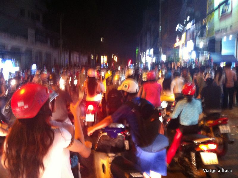 Repartits en dues motos, i carregant motxilles comencem a al·lucinar amb la sensació que estàs dins d’un videojoc. Motos i més motos, a dreta i esquerra, davant i darrere, que flueixen, i esquivem totes a l’hora si alguna decideix parar allà en mig a trucar per telèfon, anar en sentit contrari, o simplement fer un canvi de sentit creuant tota la calçada. De cotxes, persones, bicis i altres també se’n troben en el batibull.