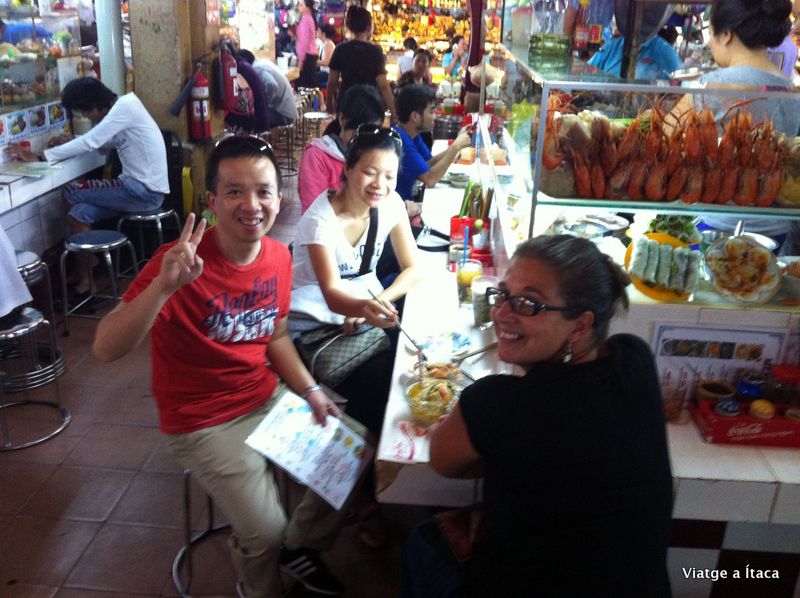 Finalitzada la visita, des d’allà i conduint les motos pels atapeïts carrers, hem anat a veure el mercat de Ben Than. Allà de tot per comprar, elements culinaris de la zona, cafès a dojo, souvenirs i qualsevol altre cosa que pugueu necessitar. A més, a la manera de la Boqueria, algunes paradetes on pots seure i menjar alguna cosa. I nosaltres, aprofitant que és la hora, doncs hem segut a prendre uns batuts realment deliciosos, i uns plats que han demanat al Thuy i el My per nosaltres. Coses típiques i diferents que mai havíem tastat, i que com no, s’han negat a deixar-nos pagar.