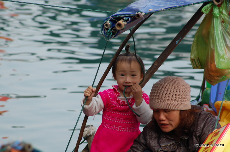 Després de la visita, a trobar el vaixell de tornada tot podent veure la vida dels habitants de Halong, o intentant vendre coses als turistes, com els nens participen d’aquest procés, o com agafen els rems per portar una barqueta.