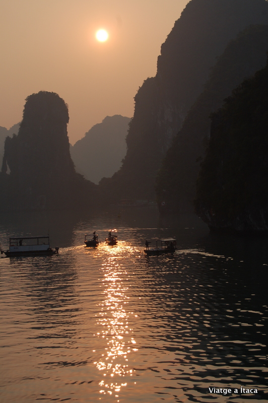 Ben d’hora ben d’hora ens hem llevat, i només anar a esmorzar ens esperava ja una sorpresa, una fantàstica sortida de sol sobre les roques càrstiques i un vaixell que ens ha fet anar corrent a buscar la càmera per poder immortalitzar aquest moment, i a més a més mentre esmorzàvem un Pho, hem pogut seguir veient com sortia el sol, crec que serà una d’aquestes imatges que et queden gravades a la ment durant molt temps, i que sempre podré recórrer al disc dur mental per repetir-la.