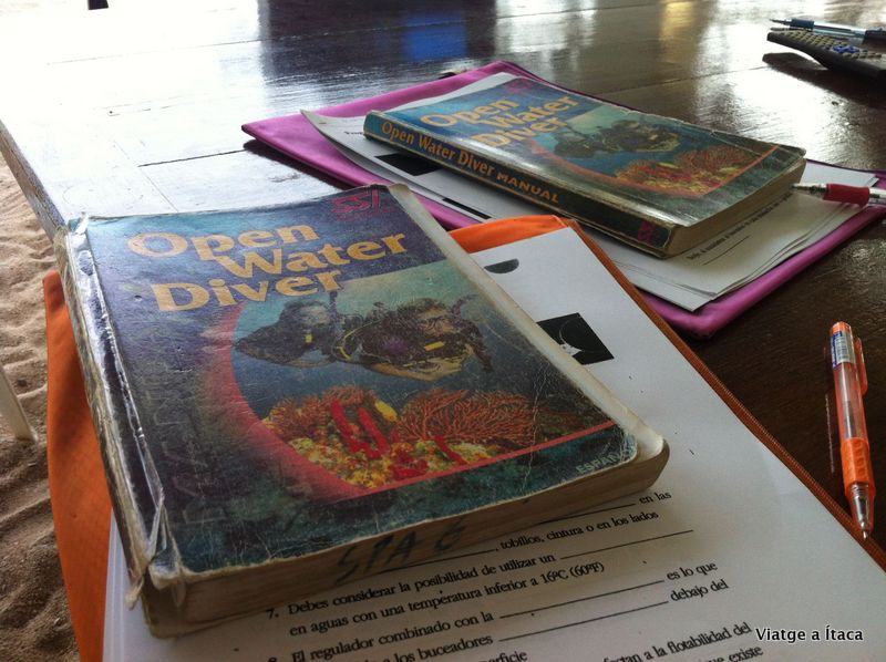Per poder fer submarinisme a aigües obertes (Open Water) hi ha diferents tipus de títols, i aquí els que més s’estilen són el PADI i el SSI. La escola on estem, Ihasia, abans impartia els dos títols, però per la flexibilitat que té, ha tendit a només fer-ho del SSI. Que vull dir amb flexibilitat? Doncs que per exemple no cal comprar els llibres (cosa que per nosaltres ens va super bé, no només per la despesa econòmica, sinó també per no haver d’anar carregant amb ells), ja que tens la informació a la web i per fer el curs te’ls deixen, i per una altra banda per superar els diferents exercicis sota l’aigua no cal que sigui en el dia que es fan, sinó que el més important és que els superis al llarg del curs.