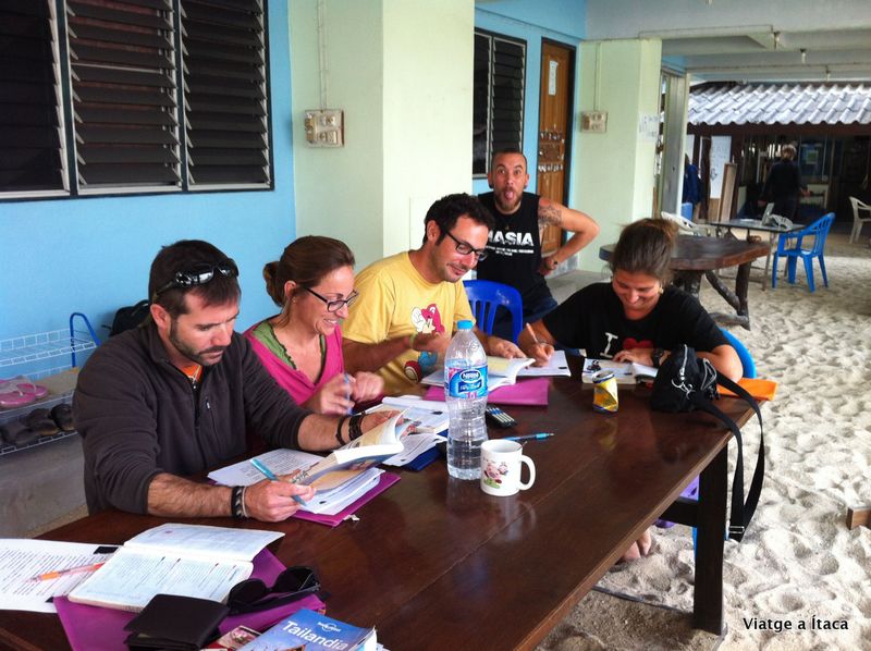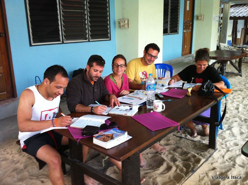 I a les 14:30… comencem el curs!!! Finalment serem cinc fent el curs, tots junts mentre fem teoria, i en dos grups quan anem a l’aigua. A part de nosaltres dos, ho farem amb el Jose i la Montse que vam conèixer ahir, i també ho farà el Jordi un català que ha estat cinc mesos a Xina estudiant i que ara està voltant una mica per Asia.