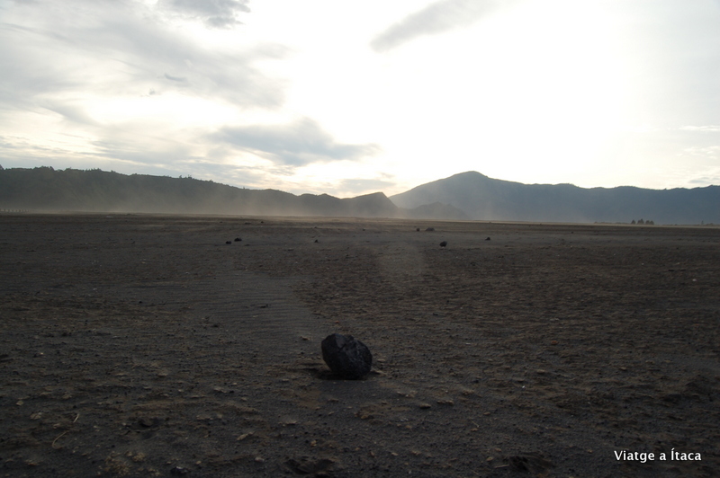 Aturada aprop del Bromo, allà genets i els seus cavalls esperen per qui vulgui que els apropin a les escales per pujar al petit volcà. N’hi ha molts, tots tapats amb mocadors, perquè el vent que bufa amb força, fa que la sorra et colpegi la cara. De pluja, de moment ni rastre, ans al contrari.
