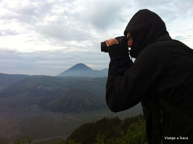 Diversos volcans, el Bromo el més petit, però és del que surt el fum, és l’estrella. Però n’hi ha més, un de més gros, i que pel que sembla només es veu des d’aquí.