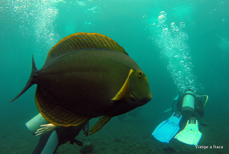 Uns peixos grocs, enormes són els nostres següents amics. S’apropen al guia. Porta un ànec de joguina petit i groc enganxat, i sembla que els atrau, així que una munió de peixos encuriosits se li apropen a ell i a nosaltres que som al costat.