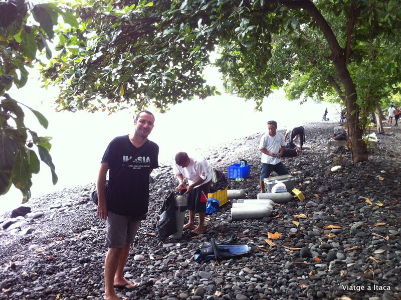Arribem a un aparcament, i el conductor, el guia i nosaltres, descavalquem de la furgoneta i caminant anem cap a una platja de petites roques negres d’origen volcànic. Allà descarreguem equip, i després d’una breu explicació ens comencem a preparar. L’entrada a l’aigua és per la platja amb l’equip posat, i ja podem veure que els corrents marítims són aquí una mica més forts.