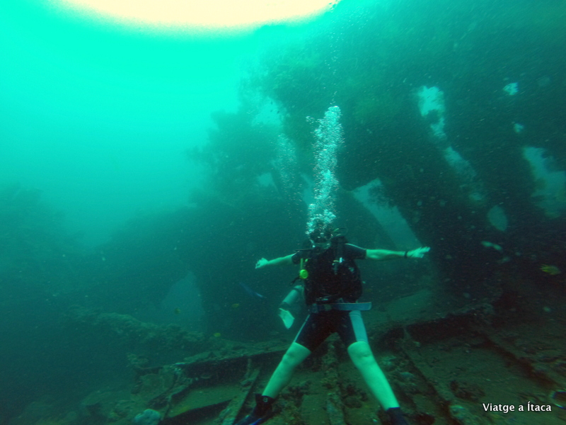 Una mica més endavant, el vaixell, on el temps poc a poc, li ha anat donant molta vida. Molts peixos i plantes que creixen sobre el ferro ja rovellat, i quasi bé no es pot reconèixer un vaixell. Si no el veus en perspectiva sembla una roca més. El vaixell es va trencant, i pots passejar per alguna zona interior, però en aquesta primera immersió només ho fem de passada. La vida submarina aquí és increïble, i estem al·lucinant amb tot el que estem veient.