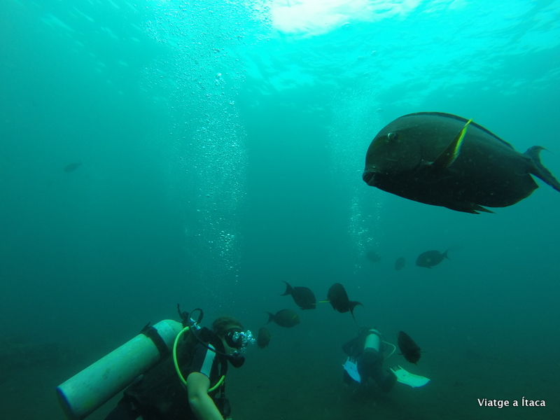 Només capbussar-nos a poca profunditat, ja comencem a veure uns peixots que se’ns apropen, i sense por, passen pel nostre costat. Quan de sushi podríem fer d’aquest llom….