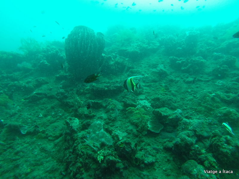 Seguim flotant, sentint aquest sensació única que és el bussejar, i descobrint el món que hi ha allà sota, i que ens va sorprenent a cada pas. Un peix tigre, que a Tailàndia són molt agressius, però que sembla que aquí no tant, passa molt a prop de nosaltres amb una pedra bastant gran a la boca. No sabem el propòsit, per sort que no són perillosos, perquè no voldríem ocupar el lloc de la pedra nosaltres…