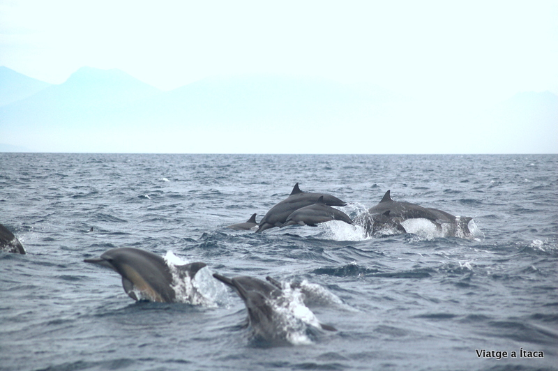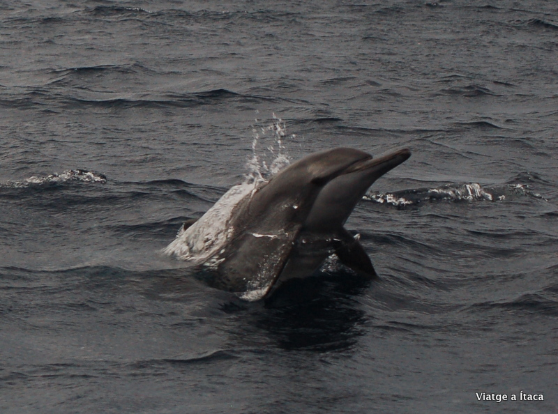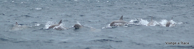 Ens allunyem de la costa, amb tranquil·litat, sense exprimir el motor, i quan ja som a una distància bona, i davant un estímul invisible per a nosaltres, el nostre capità crida i ens assenyala unes formes grises a distància. El motor es desperta, i l’embarcació accelera, i el nostre ritme cardíac amb ella, quan un grup de dofins passen a tocar-nos. Uffff quina emoció, no n’havíem vist uns de tant propers, i a més no hi ha massa gent al voltant.
